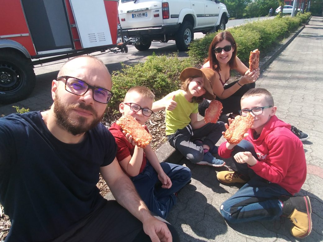 Arrêt le midi dans un centre commercial pour trouver de quoi nous sustenter. Pizza, parfait. Et nous nous laissons tenter par un dessert Allemand pris au hasard qui se révélera être délicieux. Sorte de crème chocolat entre deux génoises… Le tout dégusté sur le parking a coté de 2 monster truck. Les enfants sont ravis.