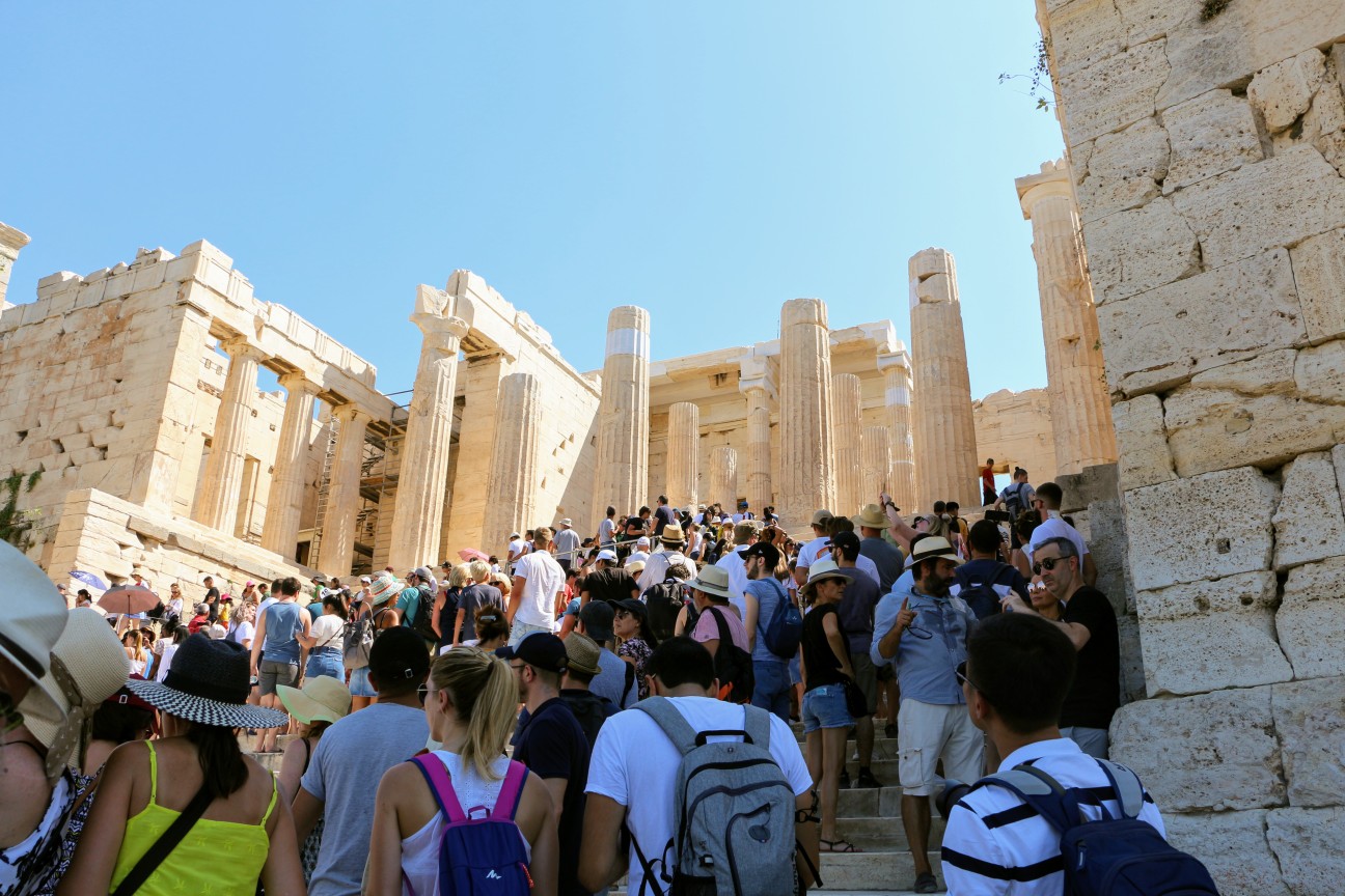 Mais cette sensation de solitude ne sera que de courte durée. Une fois franchis un petit bois et le sommet d’une colline, nous découvrons le pied de l’acropole et la marée de touristes amenés par des vagues de bus de tous horizons.