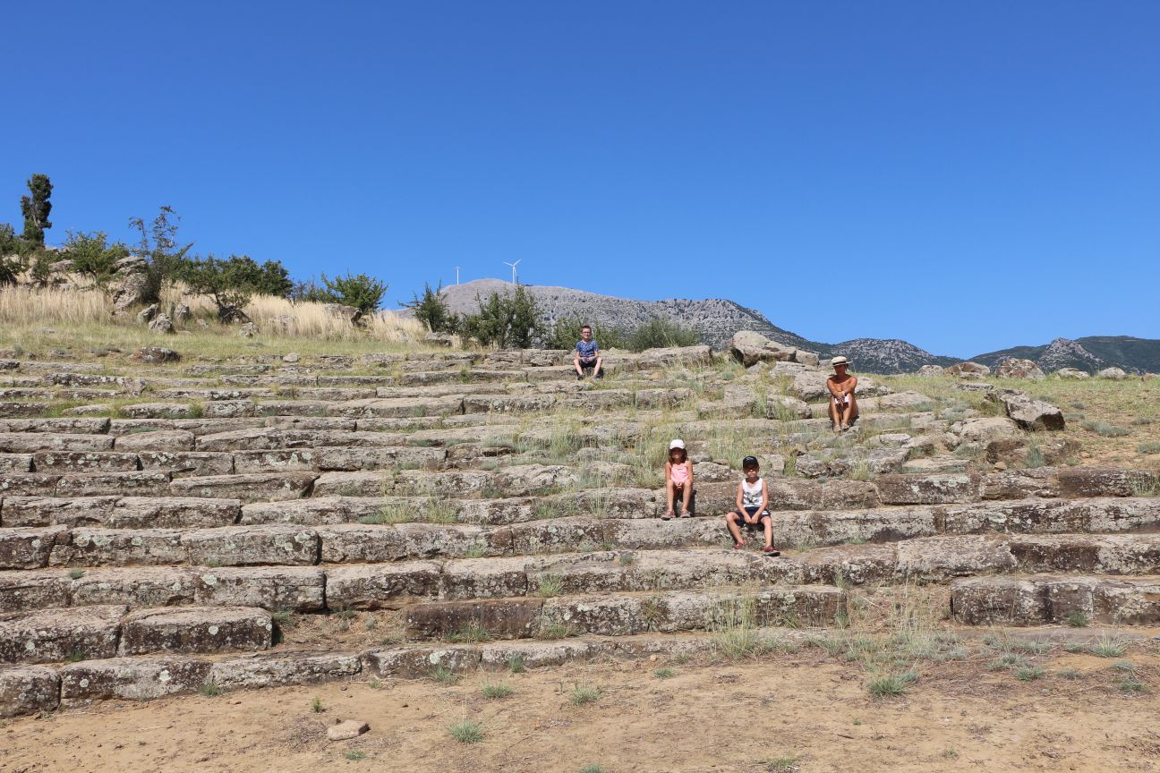 Nous sommes seuls et pouvons prendre le temps de nous assoir et d’essayer de nous plonger dans notre imagination pour nous retrouver 2000 ans plus tôt. Nous resterons un bon moment assis sur ces gradins, les enfants improvisant un spectacle antique.